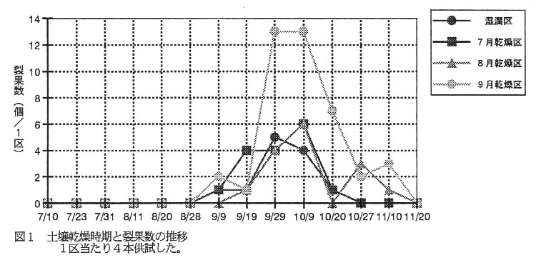 - 裂果は9月乾燥によって多くなり、乾燥時期が遅いほど裂果の発生が遅くまで続く(表1、図1)。