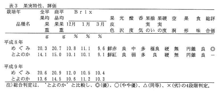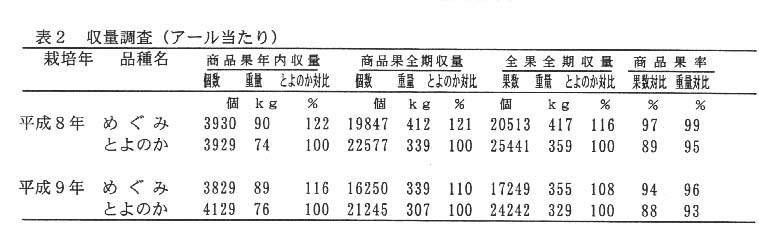 平成7、8、9年の3ヶ年にわたり特性調査を行った結果、早生性、大果性、省力性であることを確認し育成を終了した。平成10年度に‘めぐみ’の名称で品種登録出願を行った。