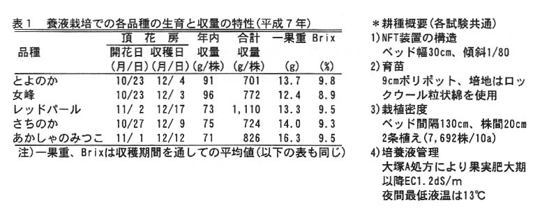 - 県下で栽培されている品種をNFTで栽培した結果、‘レッドパール’が最も多収で、養液栽培に適した品種である(表1)。