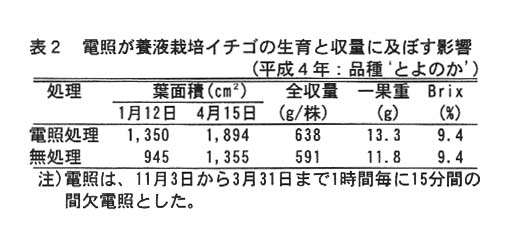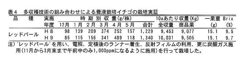 - イチゴの高設式の養液栽培は、作業姿勢の改善により軽作業化が図れる有効な栽培方法であるが、施設費が高い割に収量が少なく、経営面で問題が残っている。そこで、これまで検討して効果が認められた個別の多収穫技術を組み合わせて栽培することにより、大幅な増収を図る。