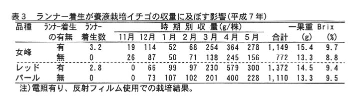 - 定植後に発生するランナーを着生させたまま栽培することで、果実が大きくなり、収量が増加する。この効果は、ランナー発生が旺盛な‘女峰’や‘レッドパール’で顕著である(表3)。