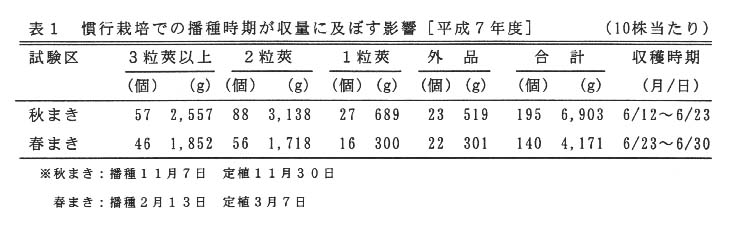 - 慣行のうね立て・マルチ(シルバーストライプ黒マルチ)・移植栽培では、春まきに比べて秋まきの収穫時期が早まり、収量も多くなる(表1)。