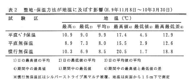 - うねを立てない平地栽培は地温の変動が少なく、裸地でも慣行栽培より最低地温が高く、簡易な不織布のベタ掛けでも地下部の保温効果が高い(表2)。