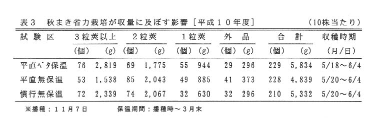 - 平地・無マルチ・直まき栽培は、不織布のベタ掛け保温により収穫開始が早まり、慣行栽培よりも収量が多くなる(表3)。