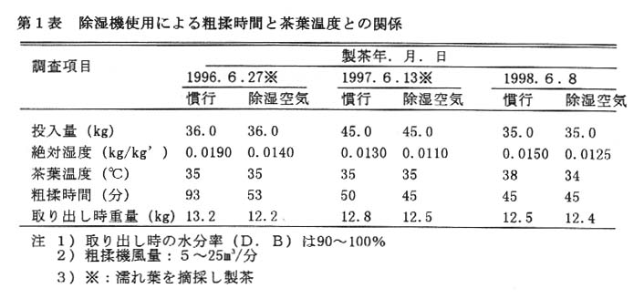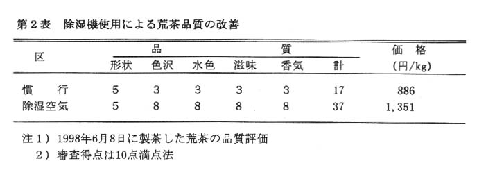 2)絶対湿度0.0170kg/kg’で0.0035kg/kg’・30m3/分、以上を確保し、絶対湿度0.0190kg/kg’では0.0140kg/kg’、0.0150kg/kg’では0.0125kg/kg’程度に下げると、高湿度条件下で品質の良い荒茶を生産できる(第1、2表)。