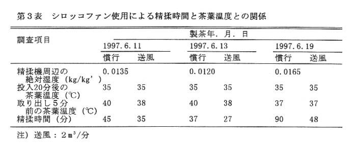精揉機にシロッコファンを搭載して、絶対湿度0.0165kg/kg’の条件下では茶葉に2m3/分の風をあてると、茶葉を35~37℃に維持して48分で工程を終え、高湿度条件下で品質の良い荒茶を生産できる(第3表)。