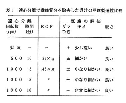 - 大豆を微砕化装置で6回磨砕処理し、さらに遠心分離機で繊維質の一部を除去した後、豆腐製造することで、ザラつきなどの物性において、常法により製造した木綿豆腐と全く差のない豆腐を得ることができる。(図2、表1)