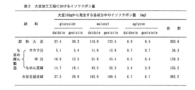 - 常法により製造した木綿豆腐のイソフラボン量は約半分に減少するが、微砕化装置で磨砕処理し製造した全大豆利用の豆腐では、イソフラボン量の損失がほとんどない。(表2)