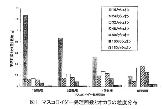 - 一般的な豆腐製造における磨砕処理は、微砕化処理の1回に相当する粒度分布であるのに対し、2、4、6回と微砕化処理を増すに従って、16メッシュの篩に留まる不溶性固形分が減少する。特に6回処理を行うと、不溶性固形分が顕著に減少し、呉汁の外観上もほとんど固形分を認めなくなる。(図1)