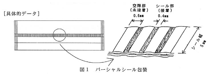 - 厚さ0.02mmの無孔ポリプロピレンフィルムを用い、100gのニラを縦60cm、横8.5cmの大きさに個包装する。このときセンターシール部を幅0.4mm、長さ5mmの歯型で1mm間隔にシールし、通気可能な空隙を約600カ所設ける(図1)。