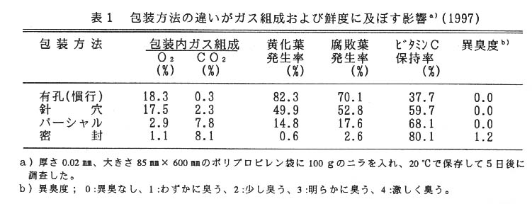 - ニラの蒸散作用から生じる水分によりパーシャルシール部の空隙か部分的に封じられるが、水封されていない部分を通じてガス交換が行われる。そして、ニラの呼吸と空隙を通じた袋内外へのガス交換のバランスから、袋内か低濃度酸素・高濃度二酸化炭素状態になり、呼吸が抑制される。このため、黄化葉および腐敗葉の発生が抑えられ、鮮度か保持される(表1)。