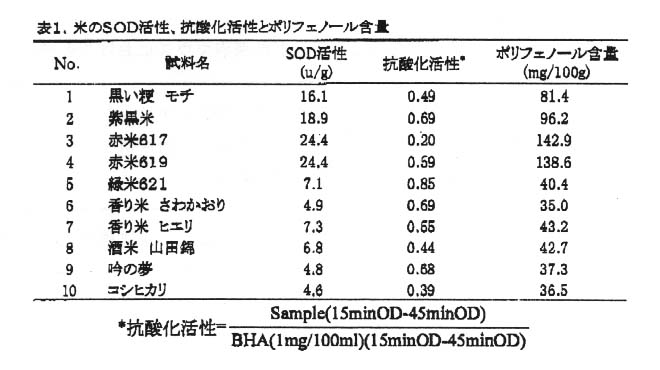 - 一般的な米に比較して緑米を除く有色素米はSOD活性と抗酸化性が高くてポリフェノール含量が多く(表1参照)、高い機能性が期待される。
