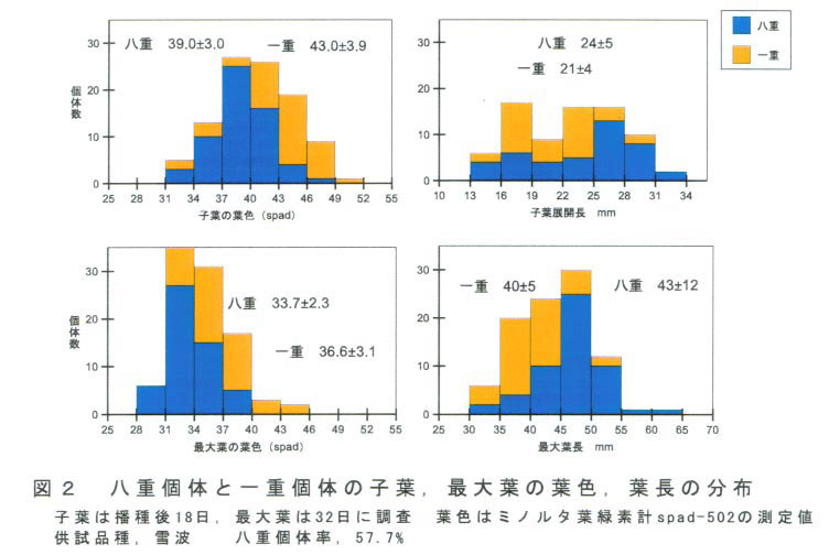 図2 八重個体と一重個体の小葉、最大葉の葉色、葉長の分布