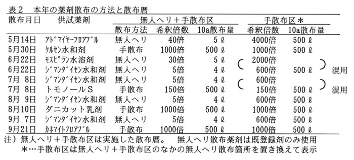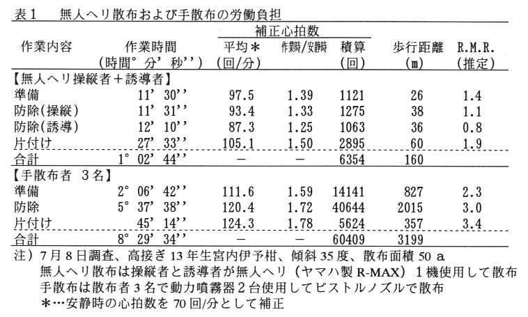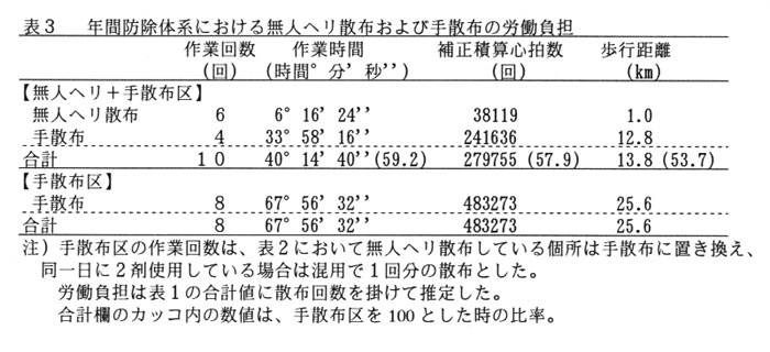 以上の結果から、無人ヘリ散布を利用することで、手散布に比べ作業能率が高まり身体負担が非常に軽くなった。