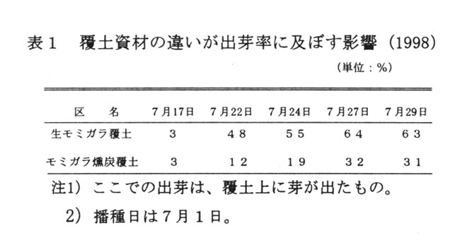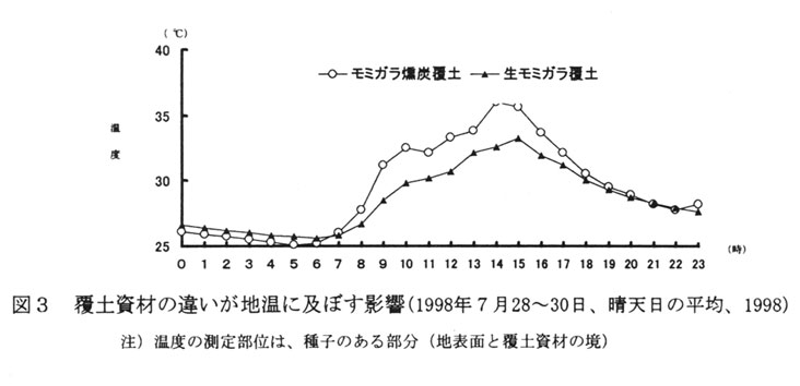 気温の高い時期に播種するので、地温を下げて発芽率を高めるためにモミガラで覆土する。生モミガラ覆土は、燻炭覆土より日中で3℃前後、日平均でも1℃程度地温が下がり、播種4週間後の出芽率は、63%と31%と倍近い差となった(