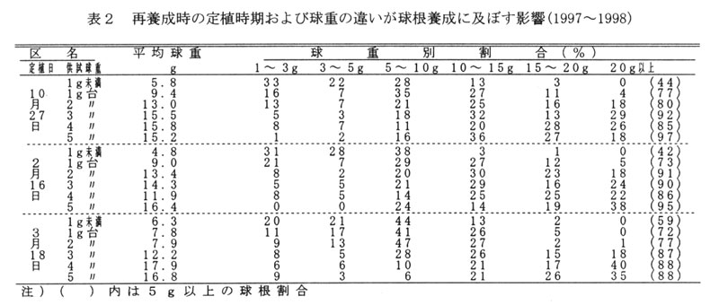 し、モミガラを覆土する。切り花用に向く小球以上の球根の目標生産量は1万球/aである。1年間の球根養成で切り花に利用できない極小球根は露地トンネルに再度定植し