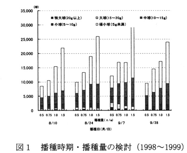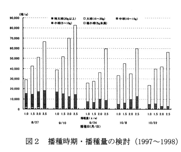 8月下旬~9月上旬に1.0~1.5リットル/a播種する。種子の発芽適温は25℃前後であり、適温域では播種後2~3週間で一斉に発芽する。出芽率や出芽揃いを良くすることで 球根肥大も良くなる。また、播種量が多いと、切り花に使えない極小球の割合が多く なる(