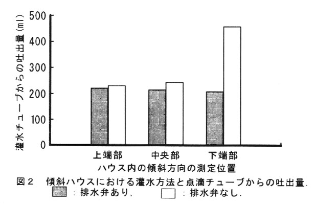 排水弁を開放してただちに排水することで,斜面下方での点滴チューブからの漏出は解消され,傾斜地ハウス内で均一に施肥・潅水ができる(
