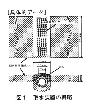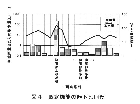 大雨によりコンクリートパイプや砕石の部分に流出土砂が堆積すると、目詰まりなどにより通水阻害が起こるため、その後の降雨流出に対する取水量は激減する。土を除去し、砕石やコンクリートパイプを洗浄することにより、取水機能は回復する(