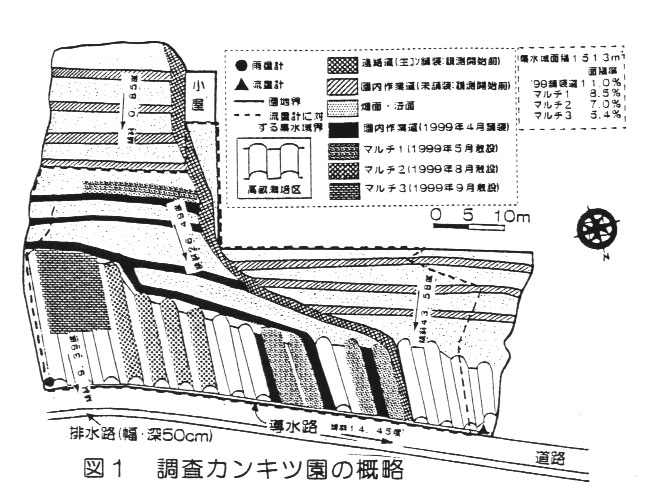 観測現地は、香川県西部の和泉砂岩系土質地帯に立地する傾斜カンキツ園で、集水域面積は約15aである。1998年6月~1999年11月の間、一雨ごとに雨量および流出水量を観測した。1999年4月、園の未舗装作業道の一部を生コン舗装(面積率11%)し、その後5月、8月および9月にマルチ栽培のためプラスチック製のマルチ資材(面積率21%)を敷設した(