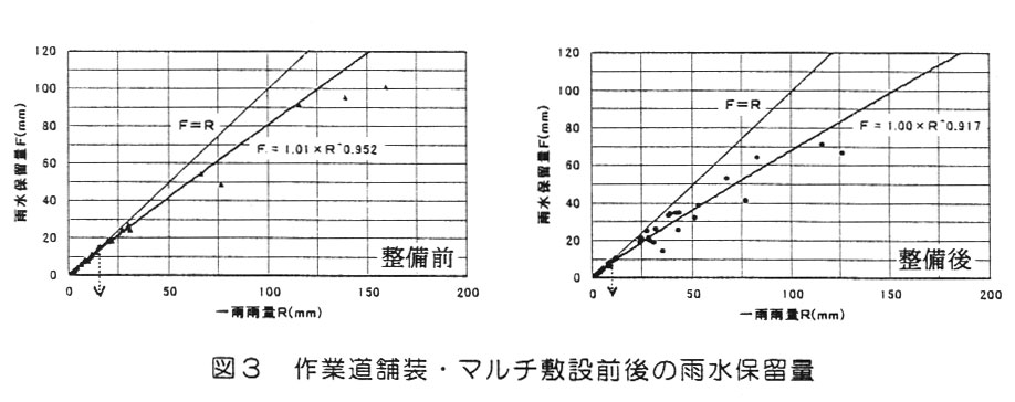 整備前では、一雨雨量15mm程度までの降雨は流出せず集水域に留まる(雨水保留)が、整備後はその値が10mm前後となる。整備後はより小規模な降雨に対しても降雨流出が生起する(