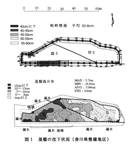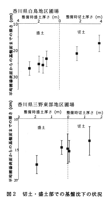 香川県、愛媛県、高知県の12の整備圃場を対象に圃場基盤の沈下状況を調査した結果、多くの圃場で基盤の沈下が見られる。香川県の例では、圃場の西半分で基盤が低 くなり、畦畔もこの付近で大きく下がっている(