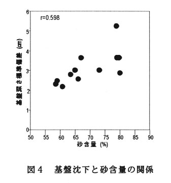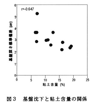 基盤深さのばらつき(標準偏差)で表す基盤の沈下は盛土部分の土性(粘土[粒径2μ以下]含量、砂[粒径20μ以上]含量)との間に強い相関関係にあり、粘土分が減少しほとんど砂分のみになると基盤の沈下が大きくなり、粘土と砂が混ざり合うにつれ て沈下の程度が小さくなる(