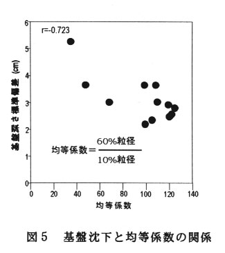 粒径のばらつき程度を表す均等係数と基盤の沈下程度の間にも強い相関関係があり、均等係数が小さくなり土の粒径組成が単一粒径に近づくほど基盤の沈下が生じやすくなる(