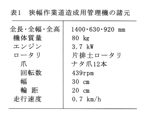 ①急斜面での操作性を確保するため、輪距を20㎝と狭くし、所要動力が小さくてすむロータリ幅30㎝の小形管理機が適しており、走行速度は0.7km/hと低速にする必要がある。