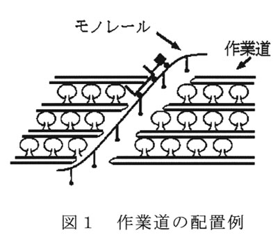急峻傾斜地に道幅の広い作業道を設置した場合、掘削法面の段差が高くなり摘果・採果の作業がしづらくなるとともに、降雨による法面崩壊の危険性が高くなる。このため、道幅を30~50㎝と狭くし、等高線方向の樹列ごとに配置して登坂能力の高い上下方向のモノレールに接続する(