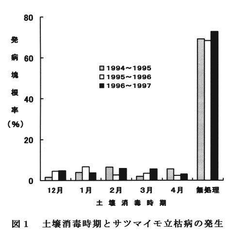 徳島県ではサツマイモの栽培地帯全域で立枯病の発生がみられるため,クロルピクリン剤によるマルチ畦内消毒が実施されている。しかし,消毒時期が3月中旬~4月に集中することから,近年になって一部の地域で同剤の刺激臭がしばしば問題となってきた。栽培時期との関係から消毒時期を遅らせることは困難で,冬期における防除効果の確認が必要となった。