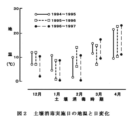 薬剤処理月日における地温(深さ15㎝)の日変化は,0~10℃あるいは5~12℃を示すことが多かった(