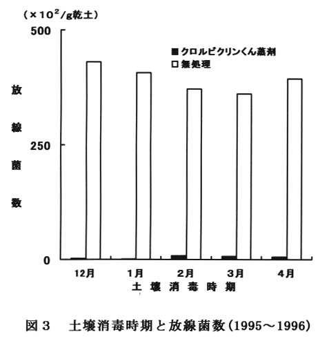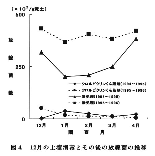 12月に薬剤を処理した場合,その後の放線菌数は4月まで増加することはなかった(