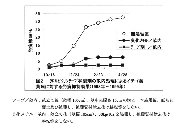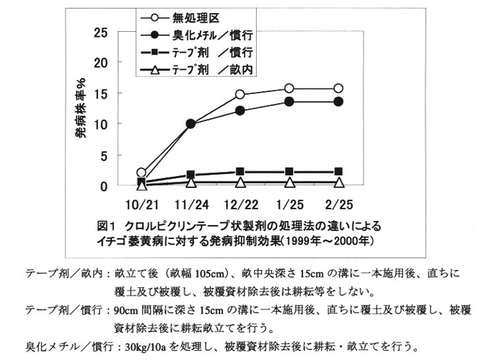 畝立て後(畝幅105cm)、クロルピクリンテープ状製剤を畝中央深さ15cmの溝に一 本施用後、直ちに覆土及び被覆(ポリエチレンフィルム0.03mm厚)し、被覆資材除去後はガス 抜き等の耕耘をせず定植時まで放置する処理法は、慣行処理に比べイチゴ萎黄病に対する発病抑制効果は高い。(