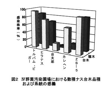 抵抗性台木「台太郎」を用いることで、発病が少なく、感染株率も低い(