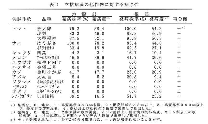 トマト(「桃太郎」、「瑞栄」、「大型福寿」)、ナス(「はやぶさ」、「イタリア赤ナス」)、メロン(「アールスセイヌ夏Ⅱ」)、キュウリ(「四葉」)、カブ(「金町小かぶ」)、アズキ(「大納言」)に病原性が認められた(