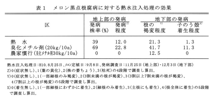熱水土壌消毒のメロン黒点根腐病やトマト根腐萎ちょう病に対する防除効果は、臭化メチルくん蒸剤(20kg/10a)と同等~やや優る(