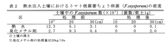 本県の施設栽培では、臭化メチルによる植付け前の土壌くん蒸処理が行われている。ところが、臭化メチル剤は2005年には全廃されることが決定された。そこで、土壌消毒法の一つとして農林水産省農業研究センターで開発された熱水土壌消毒の本県における実用性を検討する。