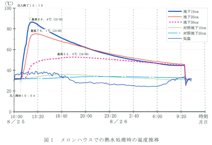 による地温上昇は地下20cmまでは60℃以上、地下30cmでは50℃前後であり、