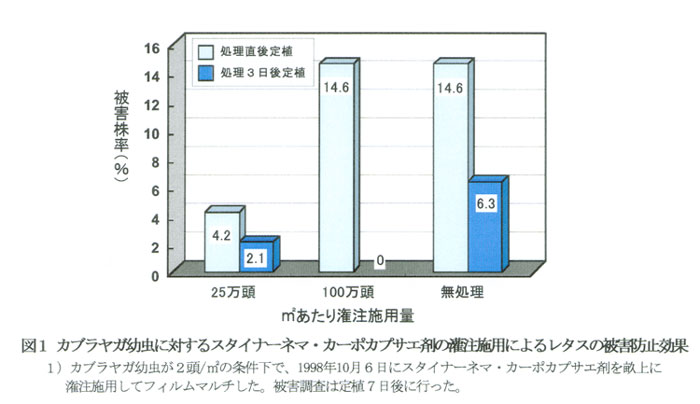 あたり100万頭潅注施用してフィルムマルチし、3日後にレタスを定植するとカブラヤガ幼虫による被害を抑制できる(