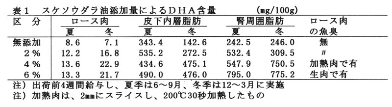 スケソウダラ油は4%以上添加しても、ロース肉及び脂肪中のDHA含量は増加しないだけでなく、そのロース肉を加熱すると、魚臭がかすかに感じられる。(