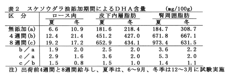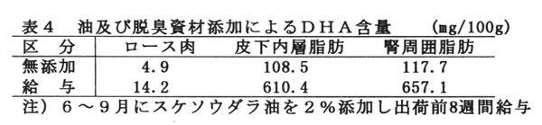 夏季のロース肉は出荷前8週間給与すると無添加に比べ3倍増加したが、冬季では出荷前4週間以上給与してもDHA含量は増加しない(