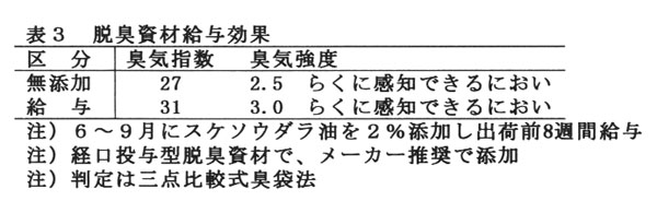 夏季にスケソウダラ油2%と魚臭低減のため経口投与型脱臭資材を添加し、出荷前8週間給与したが、脱臭効果はみられない(