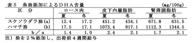 以上の結果を踏まえて、スケソウダラ油とハマチ油を肥育豚の飼料に2%添加し出荷前4週間給与したところ、冬季のロース肉中のDHA含量に差はないが、夏季のロース 肉中のDHA含量は、スケソウダラ油添加に比べハマチ油添加は1.4倍となるなど、高 い添加効果を得た(