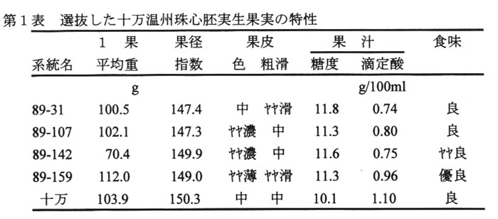第1表 選抜した十万温州珠心胚実生果実の特性