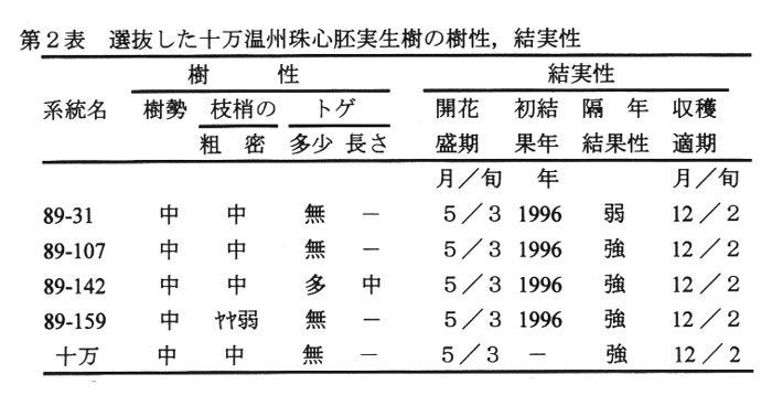 第2表 選抜した十万温州珠心胚実生樹の樹性、結実性