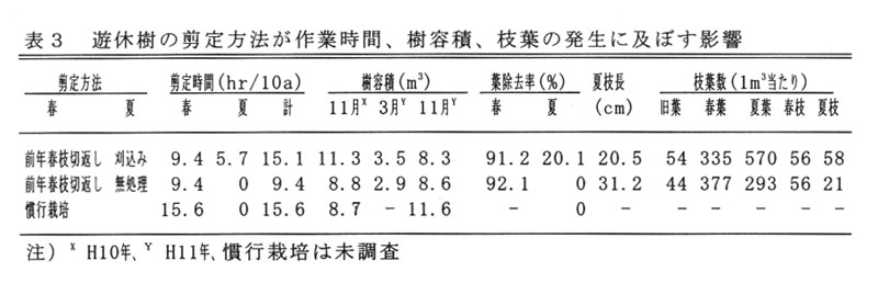 遊休年の剪定は、春(3月)に前年の春枝を切り返す強剪定を行い、夏(7月中旬頃)に当年に発生した春枝を植木用大鋏で1/3程度刈り込む剪定を行うと、夏枝の発生が多く葉数が増加し、さらに徒長的な夏枝の発生が少なく、樹の縮小化が図れる(