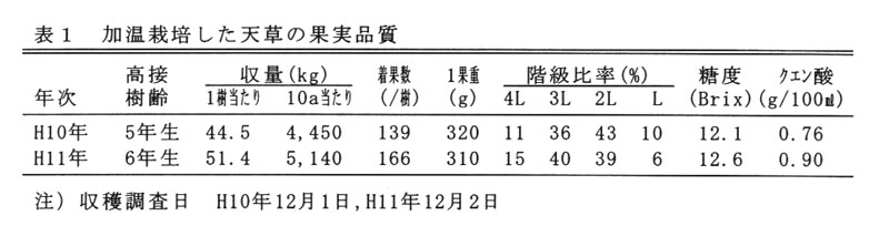 「天草」の加温ハウス栽培において、1月下旬から5月下旬まで夜温15~17℃、昼温25~30℃で管理すると、12月上旬に収穫できる。10a当たり収量は高接ぎ5年生樹で4トン、6年生樹で5トン以上となり、果実の大きさは3Lが中心となる