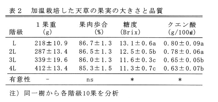 果実は大果ほど糖酸が低くなるため、贈答用果実としては階級2L~3Lが適正と思われる(