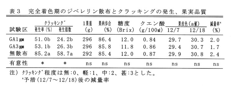 果梗部周辺に発生するクラッキングは果実が完全着色となる10月下旬にジベレリン1~3ppm濃度液を散布すると、着色に影響せず、発生が軽減される(